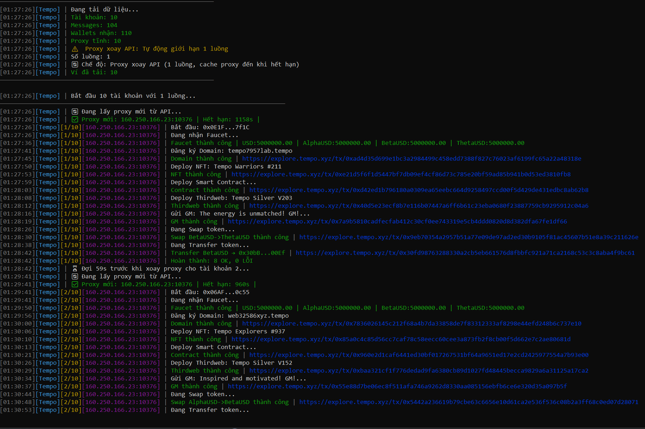 Q: Lỗi "Số dư không đủ" xử lý sao? A: Bot cần một lượng nhỏ token native (USD) để trả phí gas. Hãy đảm bảo tính năng Faucet được bật (faucet: true) trong config.json. Nếu faucet thất bại nhiều lần, hãy thử đổi IP hoặc faucet thủ công.